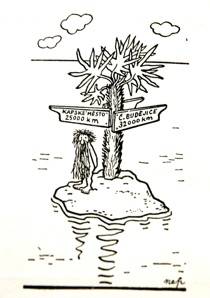 Bylo nebylo PF 2021 23. 11. 2020 / Rada nejenom pro nás z Českých Budějovic: Ať se už ocitnete kdekoliv, stále držte správný směr! Kresba Jiří Winter – Neprakta Z knihy: 106 od Neprakty, Krajské nakladatelství Havlíčkův Brod, 1961